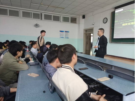 讲座开展过程中,杨正辉工程师就“数字化产业升级带来的人才需求变化如何破局”,“常见的IT岗位及发展”和“老员工宽口径就业出口”等方面进行了详细的分析讲解并对应届老员工提出了相应的建议。同时,杨正辉工程师对新兴行业“网络安全技术”做了进一步的普及。活动现场,气氛活跃,主讲人慷慨激昂,同学们积极回应,并不时记录笔记。