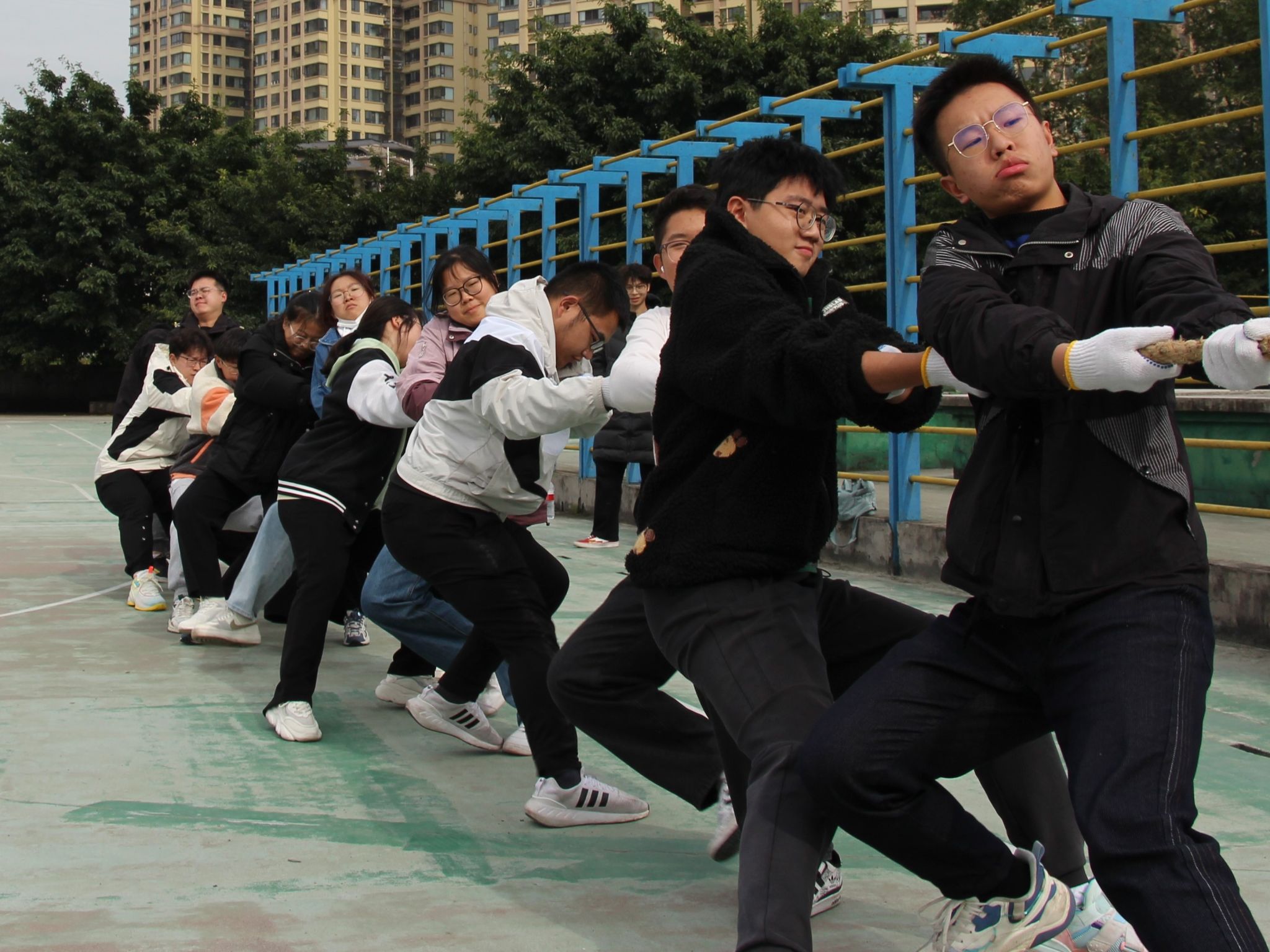 冠军争夺过程中,选手们紧握麻绳,身体向后倾斜,用尽全力对抗对手。他们的脸上写满了决心和毅力,每一个动作都充满了力量。两队之间的竞争异常激烈。有时一方占据优势,有时另一方又发起反击。双方你来我往,僵持不下。最后一声哨声吹响,物联网202303班荣获冠军,拔河比赛至此完美落幕!