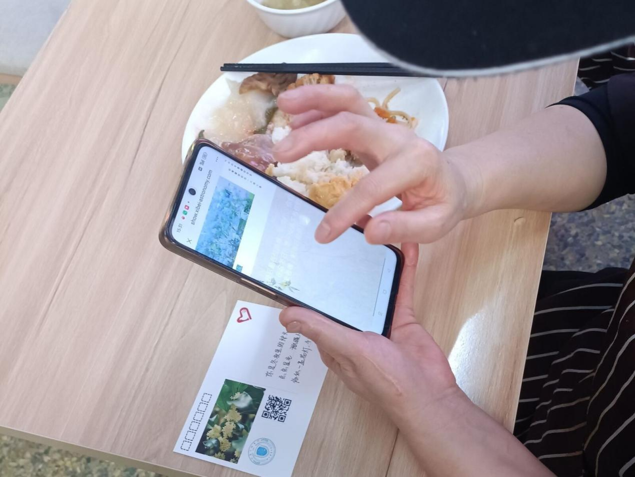 当基层工作者们扫码后看到呈现的图片和祝福语,眼中都闪烁着感动的光芒。“谢谢同学们啊!你们真是太有心了,也祝你们学业有成哦!”收到贺卡的每位叔叔阿姨,都绽放出灿烂的笑容。“今天下午我收获满满,第一次近距离深入了解到校园里各位叔叔阿姨的艰辛付出,致敬这些平凡的英雄们。”活动结束后,一位同学饱含深情分享她的感受。