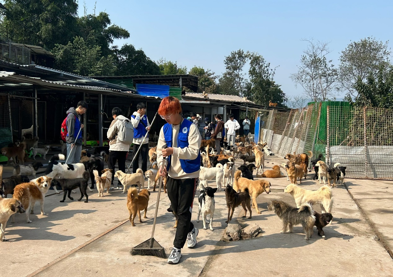 “流浪狗长期在基地生活,面对生人有一定攻击性,你们要先和它们建立信任。”流浪狗之家负责人向志愿者们嘱托道。在与负责人对接完成后,志愿者们身穿志愿者马甲,着手开展活动,为流浪小动物喂食和打扫卫生。