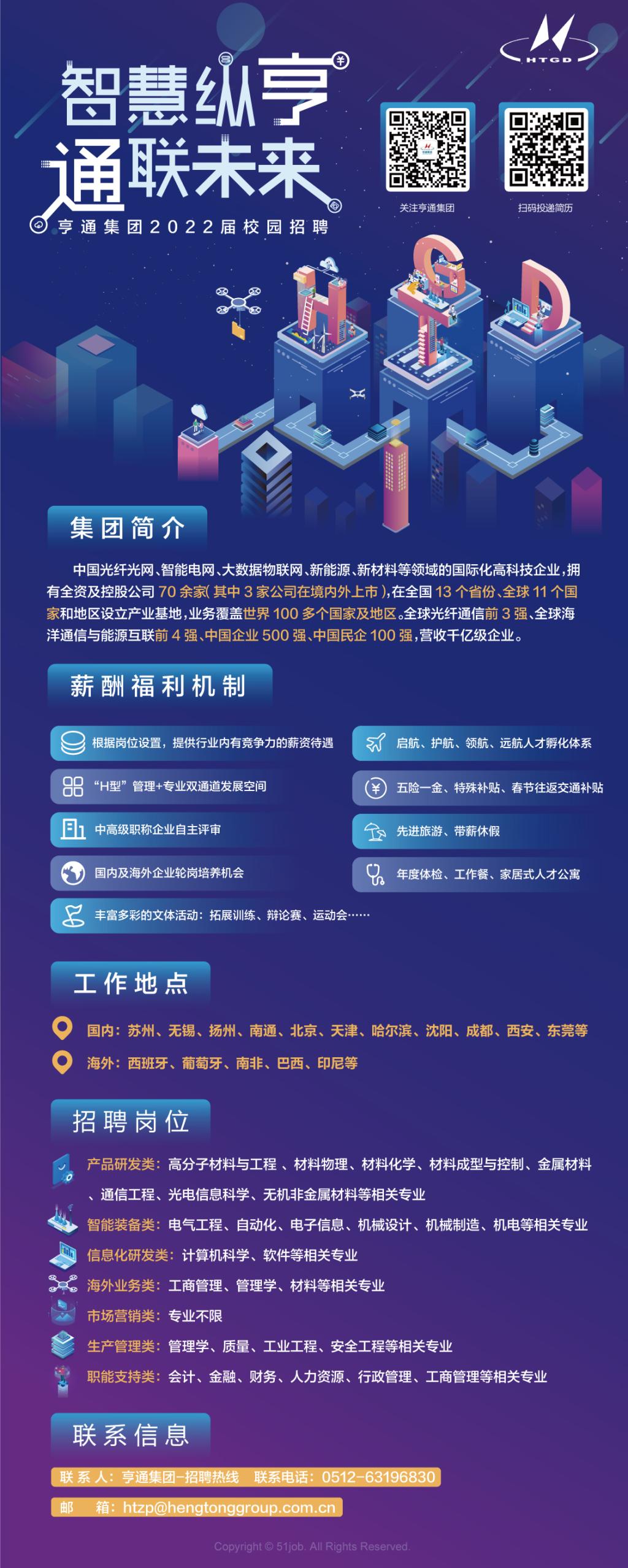 【联系信息】 联 系 人:亨通集团-招聘热线 联系电话:0512-63196830 邮 箱:htzp@hengtonggroup.com.cn 公司地址:苏州市吴江区中山北路2288号 邮 编:215200 公司网址:www.hengtonggroup.com