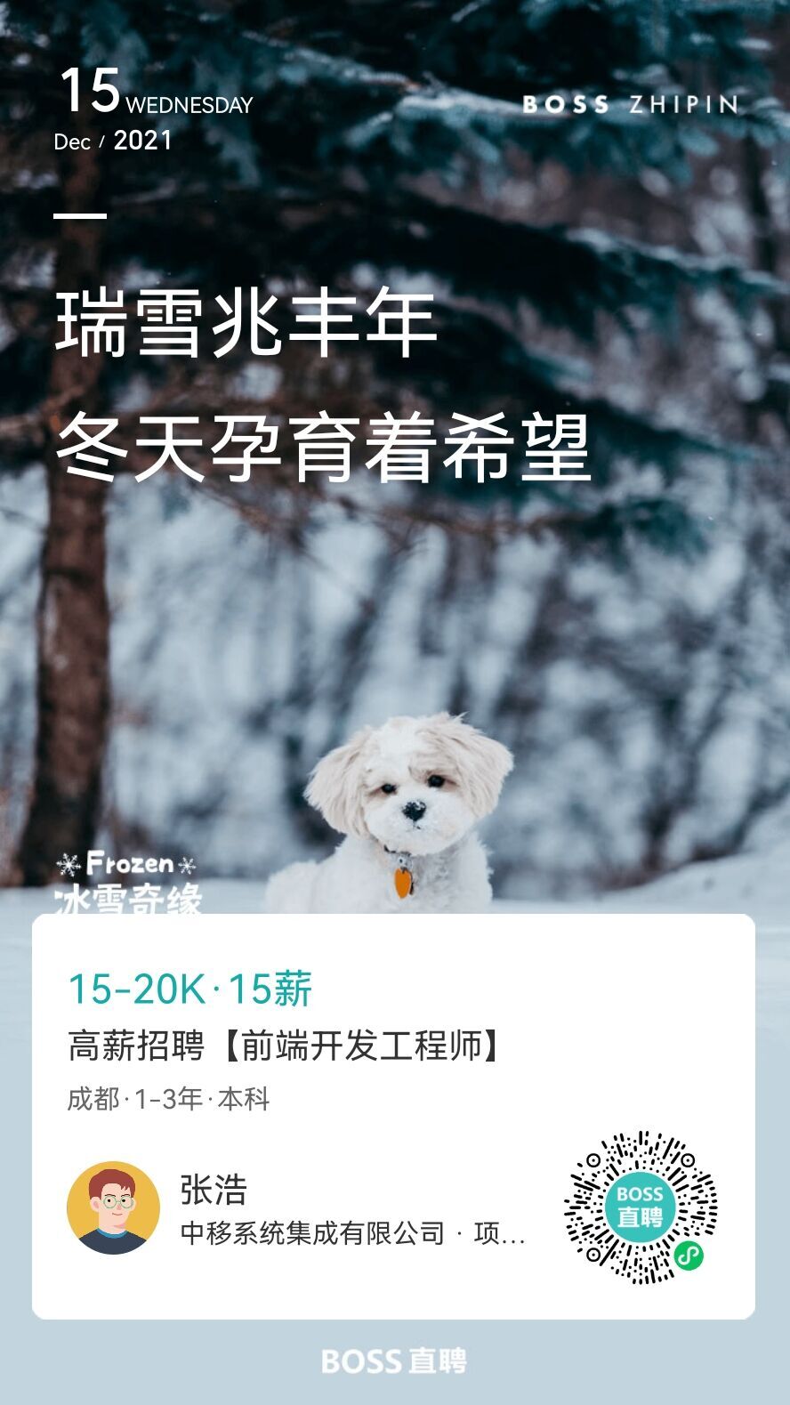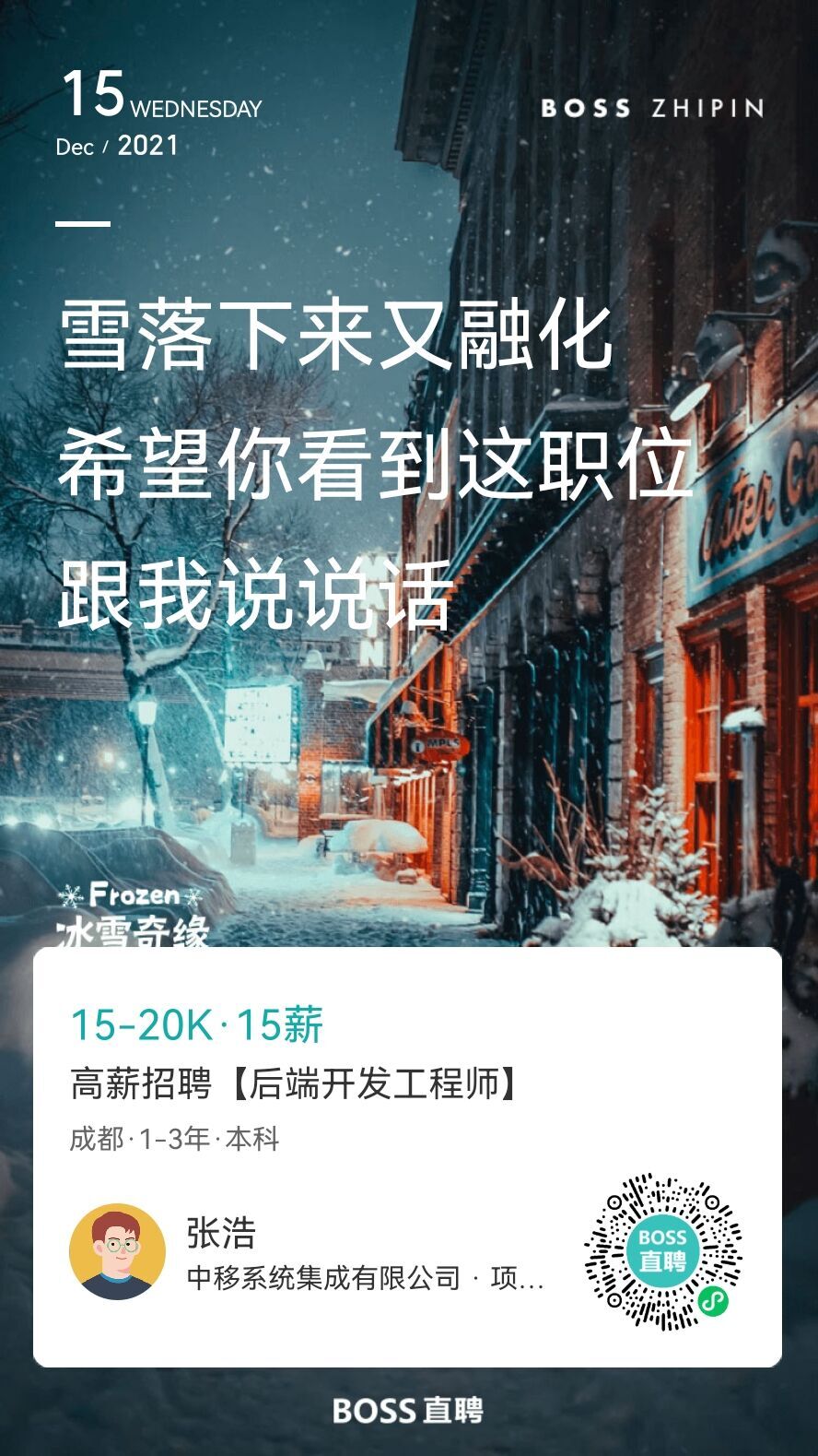 招聘前后端开发工程师和产品经理,公司为中国移动,属正式编制,工作地点天府五街,月薪15-20K,年终奖一般3-4个月工资,六险二金。要求如下: