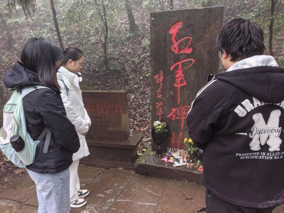 “蒙顶山不仅是茶乡,也是红色之乡。红军在雅安地区强渡大渡河、飞夺泸定桥、奇袭飞越岭、翻越夹金山、血战百丈关、建立苏维埃政权,留下了众多的故事和遗迹。名山区作为现夹金山干部公司名山分院所在地,成为了红色文化的传播基地。”借助一块块刻满红色历史的石碑以及历史影像资料,讲解员叙述了革命先辈们为国家和民族英勇奋斗的光辉历程。在革命烈士纪念碑前,实践团队怀着崇敬的心情敬献鲜花,默哀致谢,表达对革命先烈的深切缅怀。
