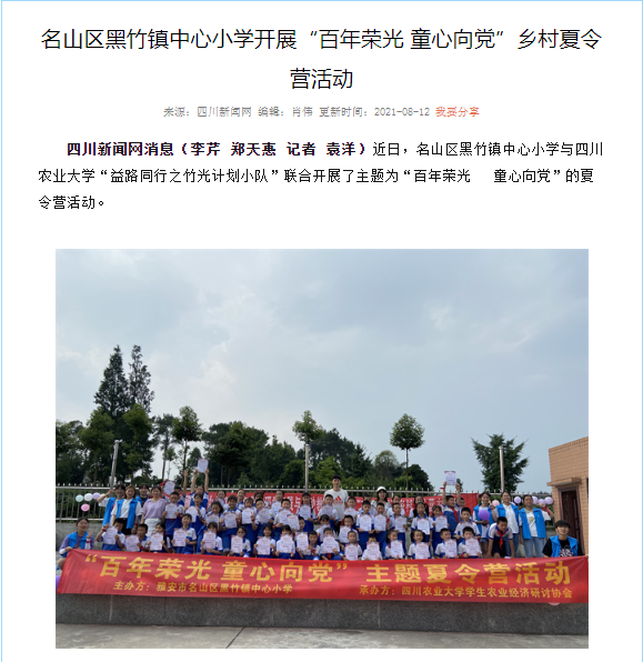 近日,名山区黑竹镇中心小学与太阳成集团tyc151cc“益路同行之竹光计划小队”联合开展了主题为“百年荣光、童心向党”的夏令... Read More
